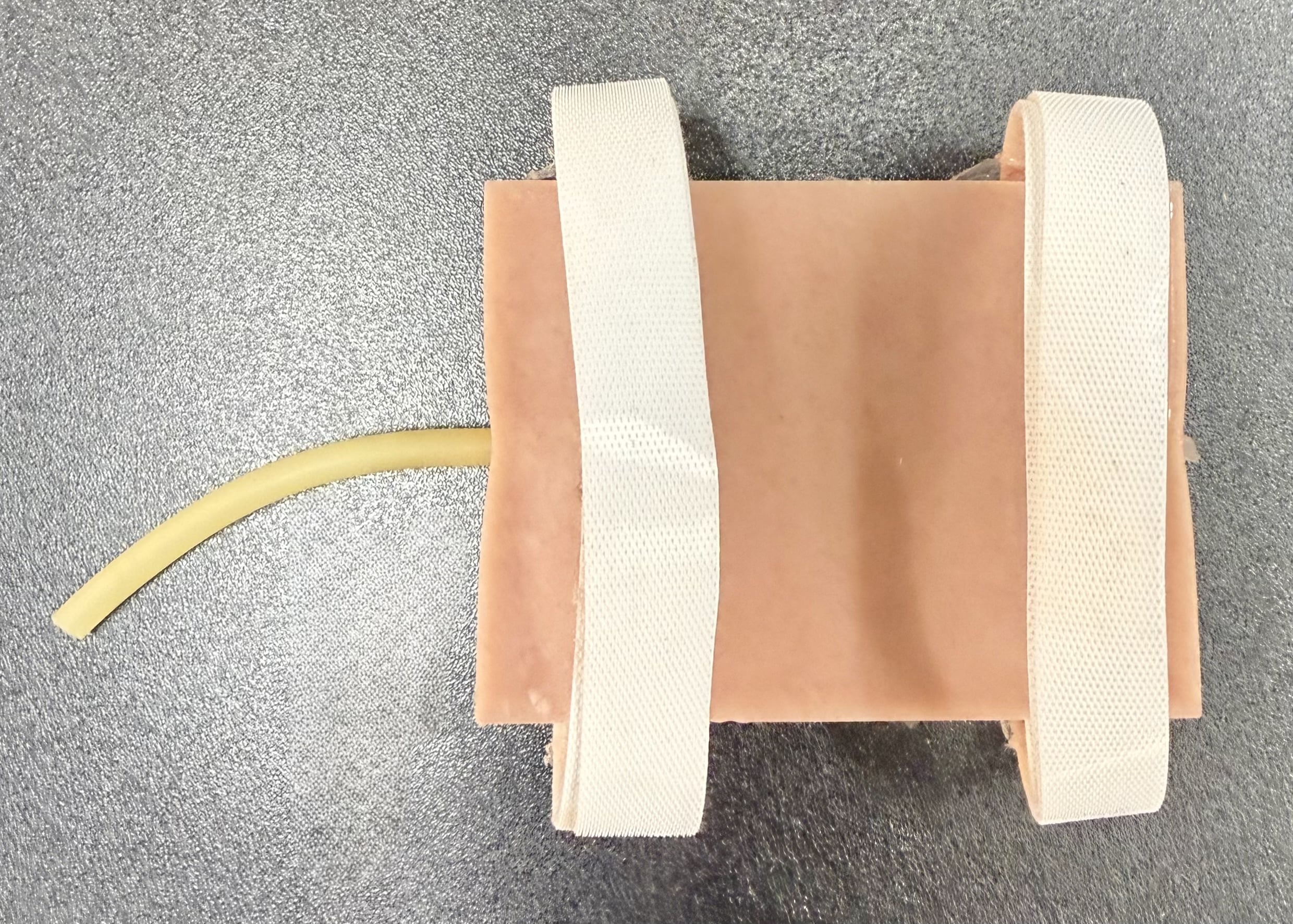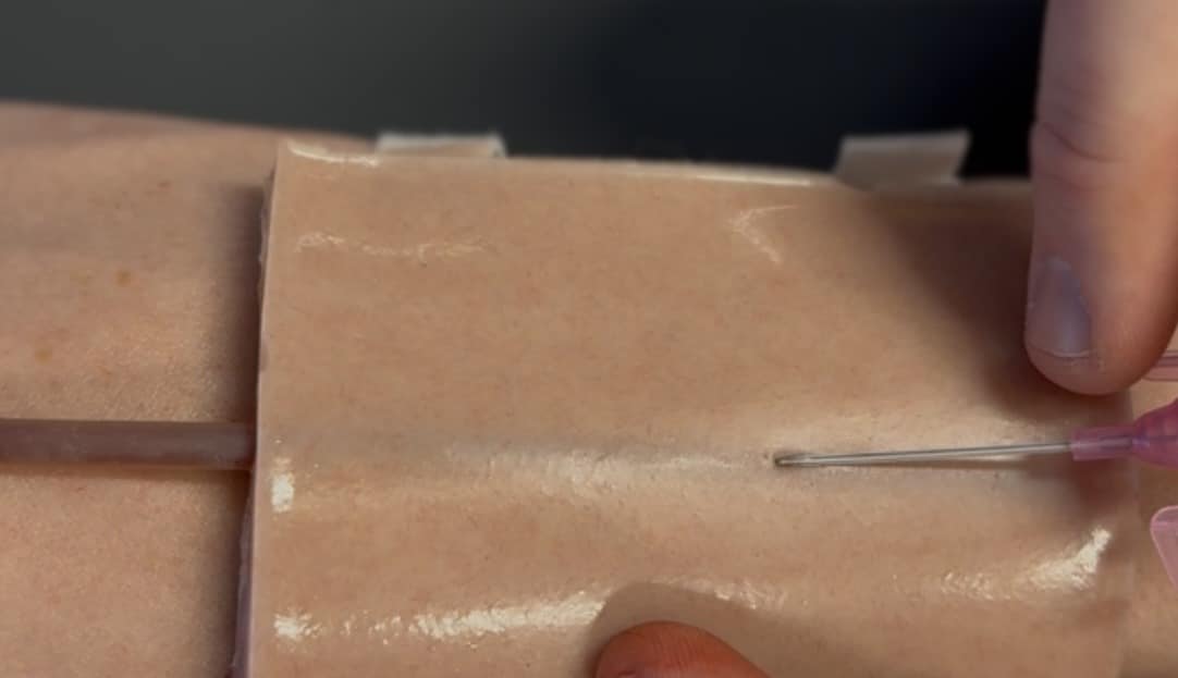 Puettava silikoninen simulaatiolaskimo IV-kanylointiharjoitteluun, jossa on keinotekoinen laskimo, muovattu pistosuoja ja tarranauhakiinnitys nopeaa pukemista varten. Mukana toimitetaan ruisku paineistusta varten.
